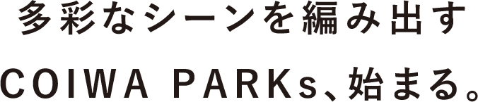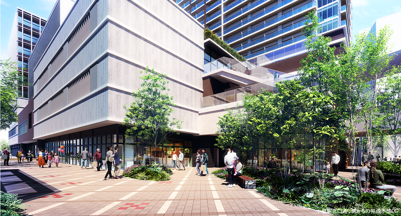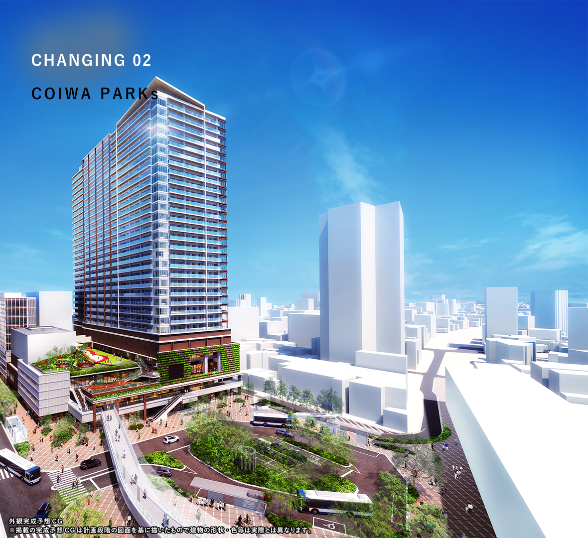 世界が大きな転換期を迎え、人と人のつながりの大切さを再認識した今、 このまちづくりの眼差しを「共に」「共通の」「相互の」意味を持つ「CO-」に込め、 私たちは新たな小岩を創っていくCOIWA PARKsを目指します。 駅前広場と複合施設を一体的につくるという特徴を活かし、広場、通り、建物周辺の空地、屋上テラスをひとつの公園として考え、 豊かな緑の潤いが心地良さと癒しを生み出し、多彩なシーンがいくつも集まるPARKsを創っていきます。
